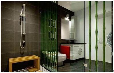 鮮艷的玻璃隔斷,打破了衛(wèi)生間的傳統(tǒng)色調(diào),空間看上去更加靈動。綠色竹林搭配上淋浴區(qū)鵝卵石的鋪設,當水從石縫流走猶如林子的小溪,使人有一種進入大自然的感覺。
