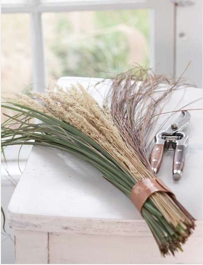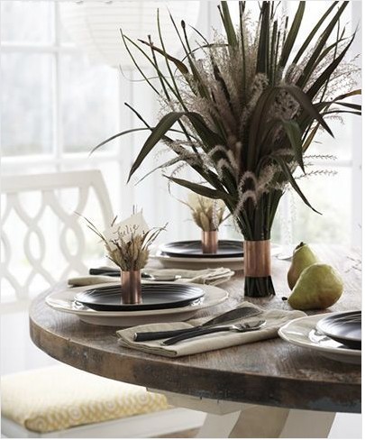 哈哈 草葉也當(dāng)上了主角了 紫葉狼尾草、馬尾草、和細(xì)葉芒、經(jīng)過修整和挑選之后,被固定在了一個(gè)用銅管制作的獨(dú)立中空裝飾物中。擺上餐桌,竟褪去了原本的粗獷,而多了一些自然飄逸。