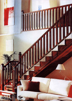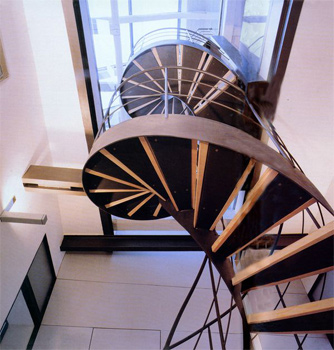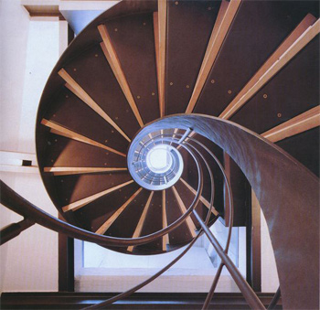 盤旋而上的旋梯不僅具有強烈的動態(tài)美,而且占用空間小。其中180度的旋梯是一種真正能節(jié)省空間的樓梯形式,無論居室平面狹窄還是寬廣,它都可以根據(jù)旋轉角度的不同而有所變化。而旋轉的扶手借助于中心柱蜿蜒向上,動感表現(xiàn)力更強,因而也最常見。