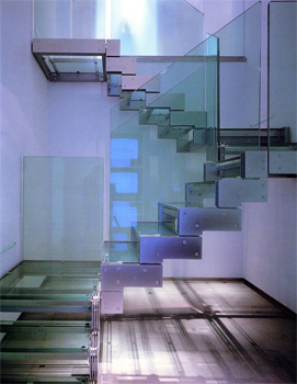 折梯是直梯的變形,雙折梯和三折梯是折梯中最常見的兩種造型,它們既有線條的交叉變化,又有直線形樓梯的簡潔大方,因而它使樓梯空間更具豐富的變化。