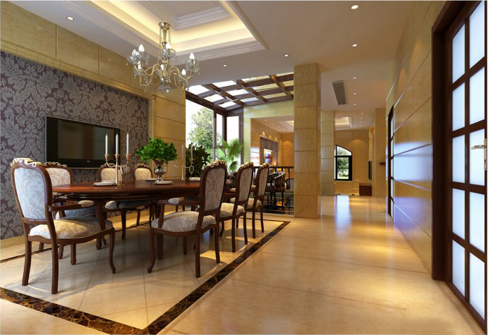 雅致的背景造型、考究的配飾、精湛的工藝,均是現(xiàn)代與古典相融的結晶,讓主人的審美情趣在優(yōu)美的線條、和諧的色調中自然流露。從玄關到客廳再到餐廳,空間流暢通明,名貴內斂的淺調天然石料是地面和墻身的主材,石材與原木飾面墻壁形成鮮明而自然的對比。純凈的米色奠定了居室的基調,放棄傳統(tǒng)歐式風格中繁復的曲線與雕花后,明快的直線條勾勒出空間的清爽氣質?!】蛷d的沙發(fā)背景運用了西班牙米黃仿古石飾面中間用石材線條內貼墻紙,墻紙中間掛上一幅藝術油畫,視覺效果既豐富又有立體感。一套大氣的組合歐式沙發(fā)配上實木的茶幾顯得主人家的品位。并彌漫出一份現(xiàn)代而古典的韻味。