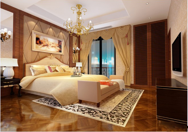 歐式元素被恰到好處地應用于各個空間的裝飾中,整所房子的格調連貫統(tǒng)一。玄關和衛(wèi)浴間面積都不大,用線條簡練的金箔古典圓鏡裝飾,客廳挑空很高,但在現(xiàn)代思維的主導下,臥室電視后的背景墻拋棄了多余的修飾,一盞華麗的水晶燈是必不可少的,設計師反復比較,選擇了造型簡潔又能折射出經典光芒的球形水晶燈,它在一片素凈的背景下,展現(xiàn)出一種內斂的瑰麗。與水晶燈相呼應的是床背景后兩盞壁燈,白色燈罩與墻壁融為一體,含蓄地傾訴著波西米**懷。