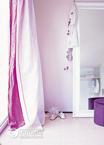 全白的亞麻窗簾襯上一層奢華的紫羅蘭絲綢,魅力即現(xiàn),為配合浪漫的紫色調(diào),絲絨座墩、 衣服上的配飾,都選用了不同深淺的紫色系。