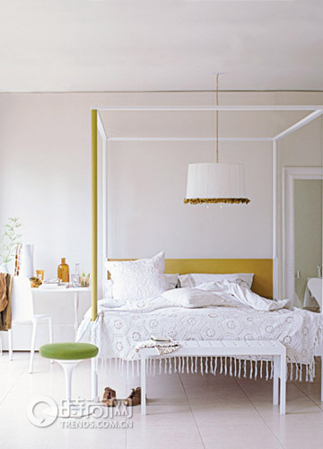 惹想嘗試使用顏色,一個低風(fēng)險的方法就是只把家具的某個部分上色,其余保持白色,比如這個綠色的床拄,或者給小凳子加上一個套子。如果厭倦了,你能隨時重新上色,或者維持燈罩的顏色以及那根相搭配的電線,只是給燈罩加上飾邊和水晶吊墜。
