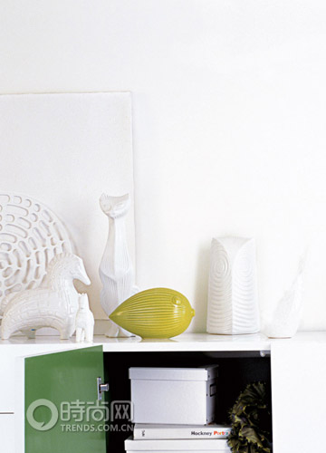 在一組單色的裝飾物中放置一個彩色的,使其成為一個白色系中的焦點。將柜子門的里面變換一種顏色,這樣即使偶爾柜子門沒有關(guān)嚴(yán),露出它們,反而成為一種裝飾。
