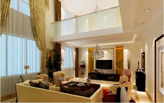 概要: 復(fù)式房同樣給人帶來別墅一樣的生活享受。兩層的空間,房間可以滿足各個(gè)不同的功能間。本案中主人要求能體現(xiàn)出他的尊貴、典雅、大氣。把復(fù)式房做出別墅的奢華感覺。這是挑高的客廳,布置上是風(fēng)水學(xué)里最招財(cái)?shù)模髁翆挸?。客廳是體現(xiàn)整個(gè)居家裝修最重要的位置。我們?cè)诜桨柑幚砩喜捎盟У牡鯚?、拼花的地面、帶圖案的地毯以及帶紋樣的壁紙。這樣無一不散發(fā)出他的尊貴氣質(zhì)。