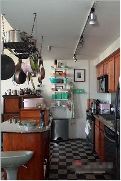 廚房貌似一個(gè)雜物間,雜七雜八的東西都放置在廚房間,特別是吊掛的鐵甲設(shè)計(jì),更像是修理庫(kù),把廚房區(qū)域設(shè)計(jì)的很獨(dú)特。另一頭白色的收納架擺放著各種色彩艷麗的廚房用具,讓暗沉空間變得亮堂一點(diǎn)。