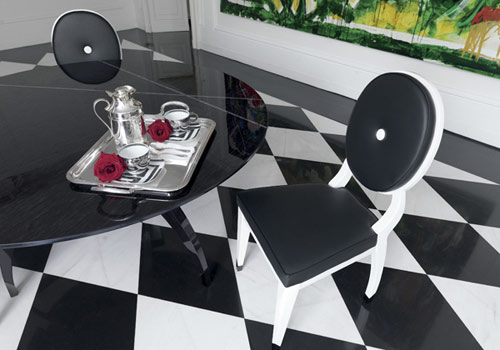 餐椅Audrey,白色上漆結(jié)構(gòu),黑白兩色真皮椅面和靠背,參考價格26500元。餐桌New York上擺放著同Rosenthal合作生產(chǎn)的餐具