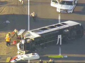概要: 中國旅行團在亞利桑那州翻車事故現(xiàn)場。(美國《僑報》資料圖) 中新網(wǎng)2月15日電據(jù)美國《僑報》報道,美國運輸安全委員會2月12日公布了中國旅行團在亞利桑那州翻車事故的原因。根據(jù)受傷司機的說法,翻車前他試圖要關(guān)好車門,但調(diào)查員則認為是司機在逆光行駛中發(fā)現(xiàn)巴士偏右之后,向左糾正過度所致。