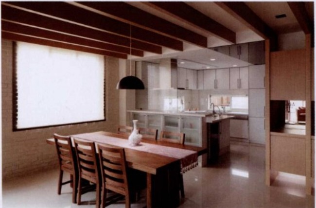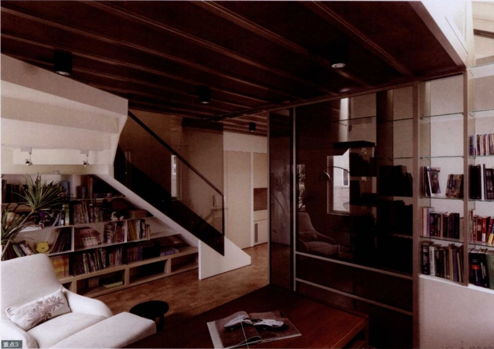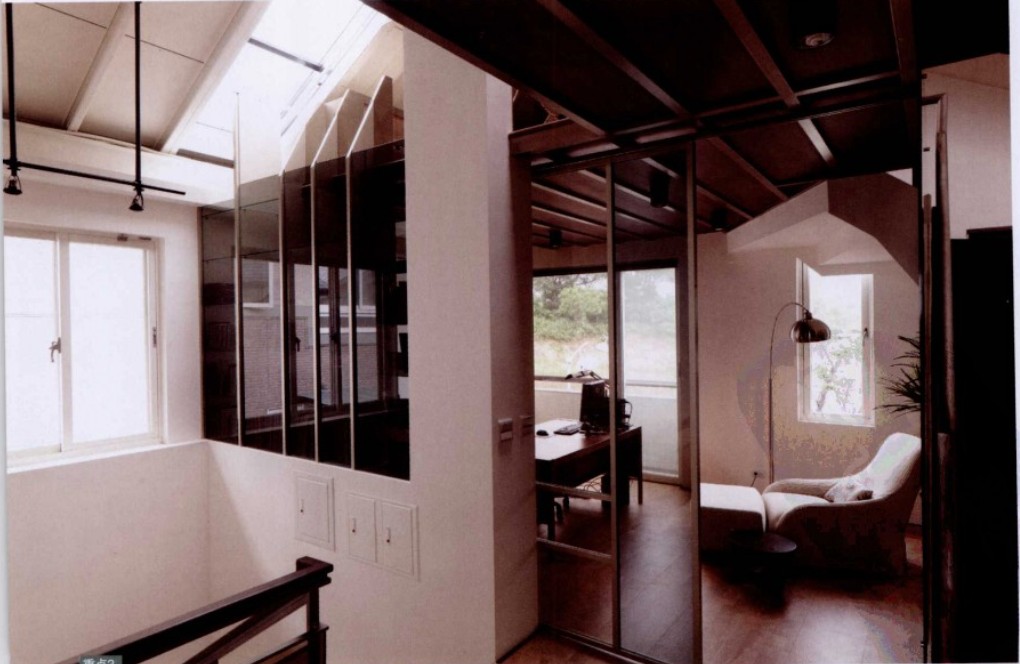 設計師運用開放式空間規(guī)劃,減少木作的使用,以突出挑高、無壓的空間優(yōu)勢,并使用環(huán)何涂料及原木地板等環(huán)保建材,不只在于健康空間的營造,也讓受閱讀的屋主所收藏的書籍有適當?shù)氖占{空間。保留斜屋頂,將挑高的區(qū)域規(guī)劃為閣樓,充分采光的天窗及玻璃扶手隔屏連接書房,滿足了收費也營造了良好的閱讀氛圍。