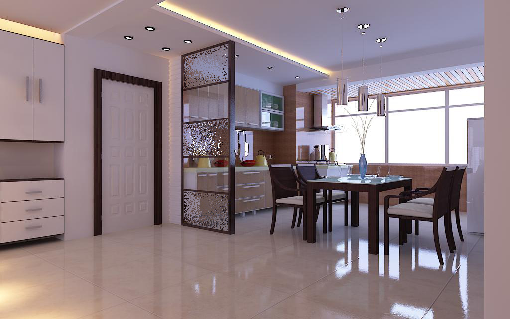 此戶型沒有放餐桌的位置,怎么擺放餐桌都沒有位置,廚房的面積也不大,最好的辦法就是把廚房的墻打掉做成開放式的廚房,客廳與餐廳僅用一個玻璃屏風(fēng)做隔墻,再就是把廚房陽臺的墻打掉與廚房相連,陽臺頂上吊條形的鋁扣板頂。廚房的柜體都是采用防火板。現(xiàn)在市場上用的最多的就是防火板了,因?yàn)樗钦w櫥柜的主流用材,基材為密度板,表面飾以防火板。廚房的頂部做了簡單的直線的石膏板吊頂。呵呵,這樣看廚房里面加放了餐桌是不是也顯得不擁擠了呢?是不是感覺明顯的加大了不少,餐廳的燈光很重要既不能太強(qiáng)又不能太弱,燈光則以溫馨和暖的黃色為基調(diào),再在上面掛幾個不銹鋼吊頂是不是顯得很大方呢?餐廳旁邊的墻上滿墻涂刷暖色調(diào)的藝術(shù)涂料并掛兩幅藝術(shù)油畫,再配上頂部照下來的燈光,廚房一下子暖意起來了,平時主人在這吃飯的時候也增加了食欲。餐廳的地面鋪的是600*600的拋光磚,一直延伸到客廳。