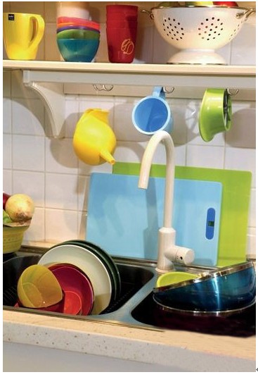 鍋碗瓢盆都用上了糖果色,搭配上白色的墻壁和白色水龍頭以及白色隔板,讓這么個(gè)樸素的色彩平臺(tái),提高了很大的飽和度,純粹的糖果色搭配,再多的色彩也不怕繁復(fù),讓廚房空間成為一個(gè)色彩大舞臺(tái),設(shè)計(jì)出一個(gè)屬于年輕自己的個(gè)性廚房空間。