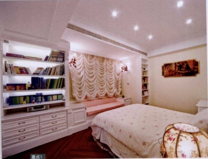窗簾占空間視覺(jué)面積不小,所以窗簾的選擇也會(huì)影響空間氣圍及風(fēng)格。窗簾造型及材質(zhì)決定質(zhì)感,若想讓空間呈現(xiàn)浪漫夢(mèng)幻的優(yōu)雅,應(yīng)選擇古典、多層次的窗簾。窗邊規(guī)劃休閑窗臺(tái),連接旁邊的書(shū)柜,提升收納功能