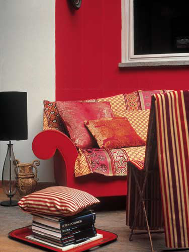 即使是西式的家居布置,同樣可以選用艷麗的東方風(fēng)格布藝做裝點。東方艷麗風(fēng)格布藝的紅色恰好與空間里的紅色墻壁、沙發(fā)屬于同一個色系,搭配出十分和諧的效果。西亞的建筑圖案與中國的傳統(tǒng)紋樣疊在一起使用,并且搭配了材質(zhì)相近、顏色相似的條紋布藝作為橋梁,令東方艷麗的風(fēng)格更為突出,與居室整體的風(fēng)格也更加諧調(diào)?!?br />