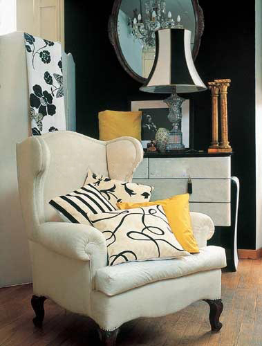 以黑白兩色為主的古典浪漫風(fēng)格布藝展現(xiàn)著一種高貴的、淡雅的華麗。黃色的布藝靠墊作為色彩調(diào)節(jié)增加在其中,鮮艷的色彩讓黑白條紋靠墊顯得活躍起來,令整個唯美的畫面更加靈動。