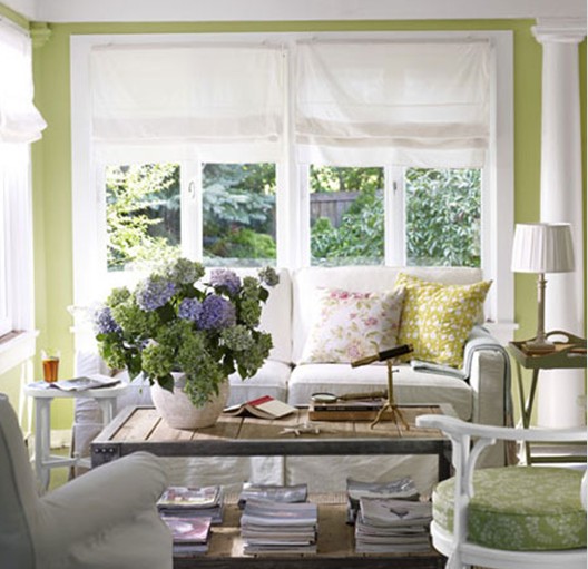 寬敞舒適時尚的房間背景墻面涂上了清新的綠色,室外明媚的陽光,鮮艷欲滴的花朵,都給房間春意黯然。房間擺設的一些家具,線條流暢簡潔,讓房間富有干凈明快的氣質,淺綠色的墻面和綠色植被相呼應,白色的窗簾和米白色布藝沙發(fā)起到很好的映襯作用,使房間色調更多變化。