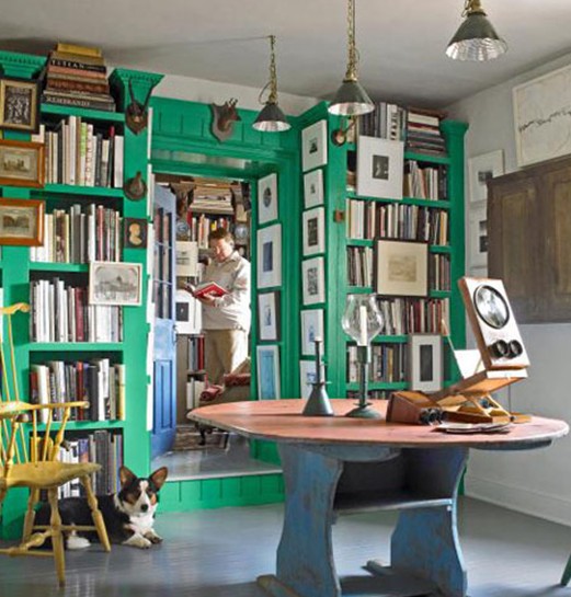 家中小型圖書館色調艷麗,內置的書架和一部分墻面都涂上了深綠色,飽和度極高的綠色墻面會讓人產(chǎn)生壓抑感,淺藍色地板、桌子和大部分的白色墻面,以及綠色墻面和白色柜體都起到了緩和的作用。書房一些古董的裝飾,小物品都帶有古典風味。