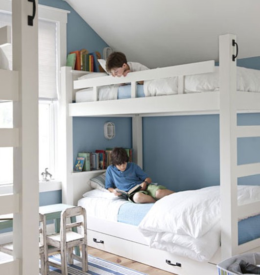 淡藍色兒童房明亮沉靜,藍與白的清透搭配寧靜卻又相互映襯,優(yōu)雅的配色似如歌的行板,浪漫溫馨,裝點出如水一般純凈又內涵豐富的臥室氛圍。而藍白相間的條紋地毯更是讓房間放佛多了一絲海天的味道,淺淡迷人。