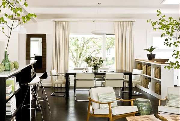 餐廳與客廳是在同一個(gè)空間里,軟裝飾方便在材質(zhì)上簡單的區(qū)分開。都是屬于現(xiàn)代風(fēng)格的休閑款,藤藝,竹編在這個(gè)空間里都很常見。我們看到料理臺(tái)的一邊墻面上有一面裝飾鏡,為空間提亮。開放式的廚房,寬敞的料理臺(tái)方便實(shí)用。
