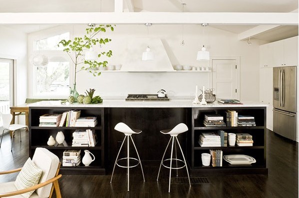 客廳與餐廳的中間還有這樣一個(gè)臺(tái)子,它的功能是雙向的。對(duì)于廚房它是非常實(shí)用的料臺(tái),而對(duì)于客廳,它又是一個(gè)收納空間。可以收納非常多的需要收納的物品。而上方的燈具也是非常有特色。