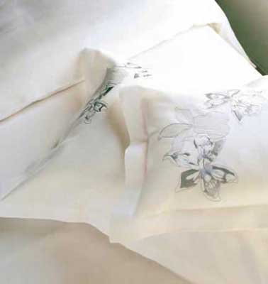 在枕頭和床單的邊緣有些鏤空處理,十字交叉,最基本的幾何圖案。這種效果看似簡(jiǎn)單,其實(shí)工藝十分考究,它需要用上好的棉,因?yàn)槔w維長(zhǎng),才不容易拉斷,同時(shí)接點(diǎn)的地方要處理得好,才能不出現(xiàn)線頭斷裂現(xiàn)象。