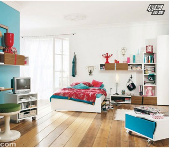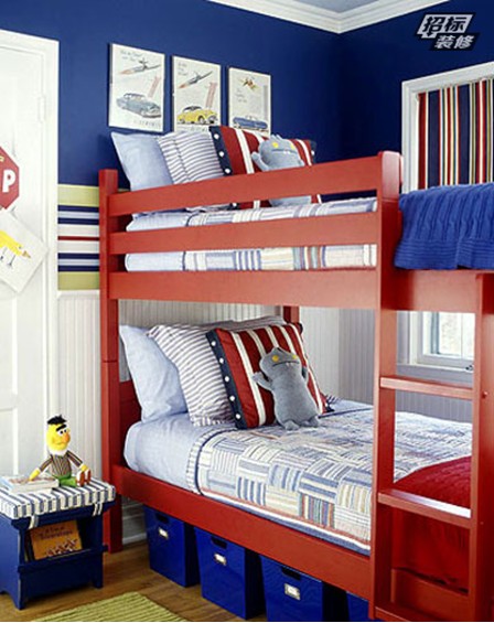 深藍(lán)色的墻面背景以及收納盒,藍(lán)與紅的營造出一片舒適的小天地。艷紅色床架、深藍(lán)色的收納盒,兩種色彩的撞擊,視覺沖突十分強(qiáng)烈,非常適合小孩子的臥室,有利于激發(fā)孩子們無限的想象能力。整個(gè)房間布置的整潔緊湊,住在這樣鮮活的小空間內(nèi),這位小朋友的成長過程該多么幸福哇!