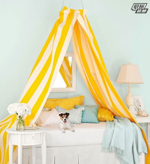水鮮的色彩搭配甜味、清爽味爆棚,主題墻面色彩鮮明的水藍(lán)色,黃白條紋的飄簾很好地襯托了主題墻。床上鋪以白色床單和藍(lán)色薄被,以及水藍(lán)色靠枕,都強(qiáng)調(diào)的主體色。白色床邊桌擺放的花瓶和造型精美的臺燈,現(xiàn)代感十足。