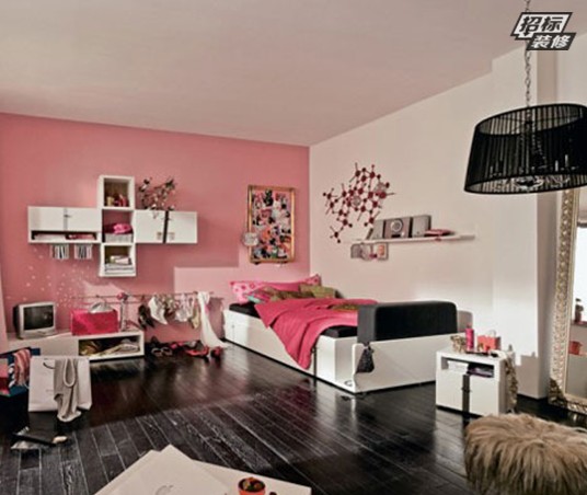 一面粉色墻占據(jù)大部分背景,粉紅色作為主色調(diào)設(shè)計(jì),給人以浪漫、甜美的感覺。粉紅色背景墻面搭配墻面裝飾,體現(xiàn)出女性的柔美與浪漫。黑色的木地板和黑色吊燈相呼應(yīng),在女性甜美氣息中加入一絲知性成熟感。白色的家具是調(diào)節(jié)整個(gè)空間色調(diào)的一筆。