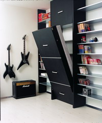 解決之道:房子小有小的巧妙,這個時候完全可以將日常的書房改造成臨時客房。難點只在于如何在不來客的時候不讓床鋪占用位置,并且休憩起來舒適。這一家的主人就把工作間、書房和客房完整地融合在了一起。主人思考頗為縝密,在裝修之初就考慮好了每個房間的功能和用途,使得設(shè)計師能夠?qū)⒋蔡煲聼o縫地安裝在書柜里。這樣既不會為不大的居室增添一間閑置房間,又擁有一個獨立的書房。