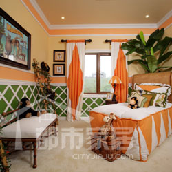 這套案例的設(shè)計靈感來自《馬達(dá)加斯加》。首先從在色彩上,設(shè)計師著重選用了綠色、米色和橙色,綠色代表電影中叢林的顏色,米色代表小島的海灘,而橙色代表的則是那里燦爛的陽光。兒童房里米色的地毯就是海灘,綠色墻裙就是綠色叢林,而頭頂天花板就是橙黃色的陽光,這色彩搭配得是不是非常貼切呢?