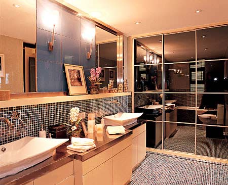 客廳、臥室和書房到處陳列著年輕新貴所喜愛的藝術擺設,洗手間也以紫啡色調的玻璃馬賽克為鋪地和墻身貼面,并配以茶色鏡面,加上石臺的折射,讓里外的空間都統(tǒng)一在另類、浪漫的格調之中。淡淡的悠然從客廳流淌到飯廳,匯入純潔的白,激蕩起一輪輕快的圓舞曲,一路高調,意欲歇而情不止……