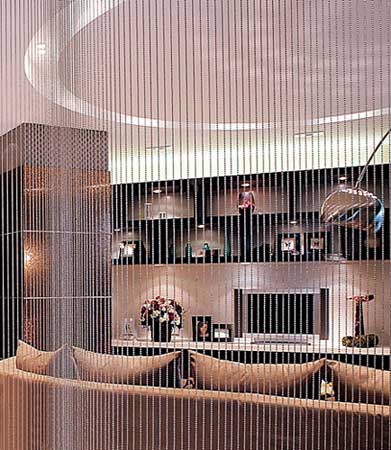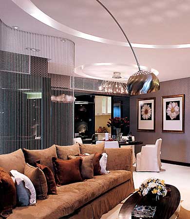 餐廳與客廳用圓形的天花燈槽增強了空間的獨立感,弧形的座燈與圓點圖案的地毯令整個空間氣氛沉靜卻不失活潑。臨空而懸的水晶珠簾是客廳的生輝妙筆,把飯廳與客廳區(qū)分開來,然而有隱約可見對方,給居室布置了一種隔而不斷的布局。