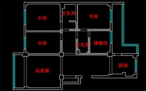 依照裝飾柱左側(cè)的直線,把書房的墻面內(nèi)縮,減小書房空間。同時(shí),拆除儲(chǔ)物間,將儲(chǔ)物間一位為二,一半合到書房當(dāng)中,另外一半留作餐廳區(qū)域。