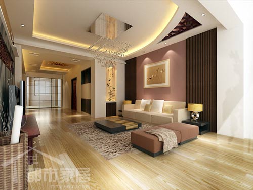 沙發(fā)背景墻中部和兩座沙發(fā)選用了純度不是很高的暗粉色,給人帶來一種前衛(wèi)伴隨著回歸的感覺