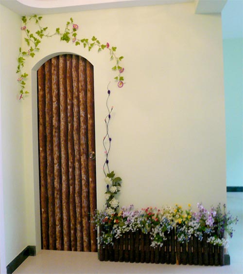 這個(gè)花園的木門上喇叭花調(diào)皮的盤上了木門,貼上了木紋的墻紙,就成了花園里的木門
