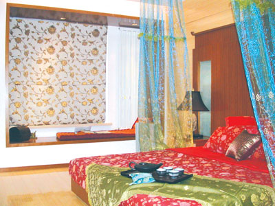 而紗簾也在此發(fā)揮到極致。所有的窗簾都是紗質(zhì)的,以藍色和紫色為主,隨風飄曳,怎么看都是一幅東南亞風情。臥室里的床品多是以泰絲和麻織品為主,混合陶土的紅色床品熱情奔放,而飄逸在床兩側(cè)的藍色紗簾則和紅色床品以及印花的窗簾互相映襯,營造出舒適飄逸的浪漫氣息。