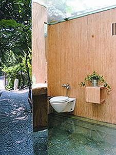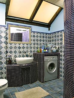 基調(diào)是一片蔚藍(lán),藍(lán)色的馬賽克、灰藍(lán)色的地磚。因?yàn)榭臻g相對(duì)較大,所以主人就有了很大的發(fā)揮余地,為洗衣機(jī)量身定做的小臺(tái),上面還可以放一些雜物,弧形的洗手池、手盆與同樣造型的整體浴房呼應(yīng)著,“整體浴房”其實(shí)是主人自己用磚砌出來(lái)然后貼上藍(lán)色馬賽克做成的。大面積使用馬賽克,并在頂部鋪上了溫暖的桑拿板,刻意做成的斜屋頂式燈箱是主要光源,設(shè)計(jì)的本意是希望給這個(gè)沒(méi)有一扇窗子的衛(wèi)生間,帶來(lái)一種有天窗的錯(cuò)覺(jué)。