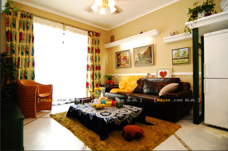 客廳中設(shè)計(jì)了幾段眉檐,它們并沒有連綿不斷,而是錯(cuò)落有致的斷開,制造了一種殘?jiān)珨啾诘囊饩?。沙發(fā)旁的冰箱上方設(shè)計(jì)成涼亭狀,恰似戶外花園的景致。墨綠色的家具,有點(diǎn)復(fù)古,有點(diǎn)張揚(yáng),又有點(diǎn)刁巧,仿佛讓人感覺回到了原野上。客廳的吊扇燈,復(fù)古的精致雕花,展現(xiàn)優(yōu)雅、細(xì)膩的風(fēng)情。
