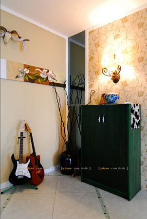 餐柜旁的空地是一塊休閑區(qū)域,擺放了吉他和一些收藏品。墻上的花朵妖嬈纏繞,餐柜的放置賦予沉穩(wěn)的氣質(zhì),墻上的壁畫用來巧妙地遮擋配電箱,羚羊角展現(xiàn)了神圣的味道。