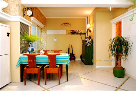 廚房門口便是餐廳,鋪上綠色條紋桌布,再配上藤藤制餐椅和花瓶,營造了清爽舒適的環(huán)境。墻壁鋪貼了鏡子馬賽克,人在家中的活動(dòng)都能在鏡中顯現(xiàn),使居室有動(dòng)感和生機(jī)。