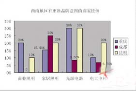 圖表說明:在本次調(diào)查中,參與調(diào)查的商家分別是重慶的45位商家,成都的50位商家,昆明的50名商家。其中成都沒有商業(yè)照明 的商家表示要更換品牌,而重慶和昆明經(jīng)營光源電器的商家要更換品牌的呼聲最強烈,高達的30%商家表示要更換品牌。