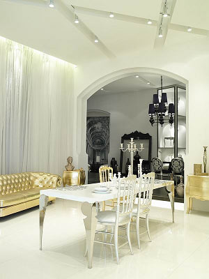 在新開幕的JIAconcept尊家家居的旗艦店內,只設黑、白、金、銀四個展示區(qū),復古風格家具在這四種色調下看起來好似一幅幅現代摩登場景。眩目的金銀光澤帶來富有沖擊力的奢華視覺;黑與金的沖撞,帶著些許妖媚;而柔美、安嫻的白色,褪去了金銀光澤中的世俗煙火氣,略加少許淡藍色的點綴,幾乎呈現出某種天使般的圣潔氣息。