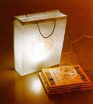 5、調(diào)整手提袋的外形,用透明膠帶固定帶底的電線,如果手提袋自身的底版太輕,則需另外安裝一塊較厚底板,或加重物在袋底。最后燈泡裝上即可。