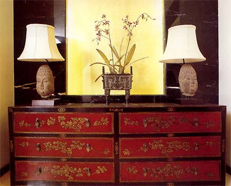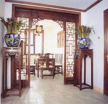 中式家具的構成主要體現(xiàn)在線條簡練流暢,內(nèi)部設計精巧的傳統(tǒng)家具(多為明清家具為主)或現(xiàn)代家具與古典家具相結合,多以深色為主,書卷味較濃。條案、靠背椅、羅漢床,兩椅一幾……都經(jīng)常被選用。傳統(tǒng)的書房里自然少不了書柜、書案以及文房四寶。臥室中雕花的大床,低垂的圍幔,無不透出中式的沉穩(wěn)。中式的環(huán)境中也常常用到沙發(fā),但顏色與樣式仍然體現(xiàn)著中式的古樸。