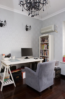 而書房又是另一種腔調(diào),白色基礎(chǔ)上的Art Deco風(fēng)格。門是隱蔽在客廳電視柜后的背景墻內(nèi)的,左側(cè)一邊推開來,先看到兩塊半透空的簾子,自天花板至地板垂直懸掛,不同的花紋,同樣薄而輕飄的質(zhì)地,做了視線上的一個小小阻隔。轉(zhuǎn)入屋內(nèi),右手邊一張裝飾風(fēng)格的邊柜,白色油漆底下還能看見木材的紋理;左手邊靠墻一張書桌,造型凹得很別致;書桌右側(cè)靠窗是一個白色書架,同樣帶一點裝飾風(fēng)格;書桌左側(cè)一面墻全部做成了衣柜,與邊柜同樣風(fēng)格,作為這間屋子的收束。與風(fēng)格變化相應(yīng)的是,這間屋子里的色彩也柔化了一點:黑色被換成了灰色,包括一個單人沙發(fā)、一幅窗簾。窗簾是帶閃的桑蠶絲質(zhì)地,底下一個飄窗,鋪白色墊子,林琳說這個房間“好看,但就派不出太多用場“。其實這跟書是同一個道理:讀書能直接派上什么用場呢?可是整個兒的讀書氛圍本身就是有意味的。