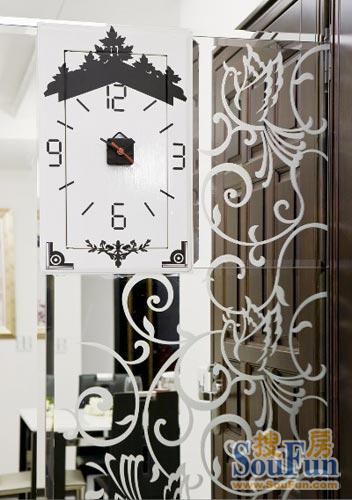 鏡面的應(yīng)用拉大了空間視覺感受,時(shí)尚的花紋彰顯出貴族品味。內(nèi)嵌的鐘表巧妙的將“時(shí)間”變?yōu)檠b飾,為嚴(yán)肅的格調(diào)增加了活潑的味道。