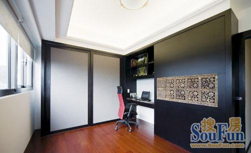 工作間大方時(shí)尚,柜門上的傳統(tǒng)鏤空裝飾彰顯了主人的文化品味。深色空間的凝重被幾處跳色渲染出溫暖氣息。