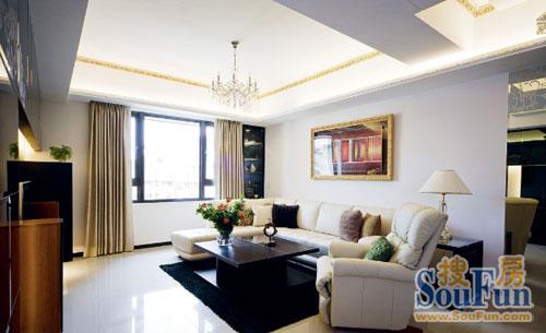 從陽臺看向客廳:白色沙發(fā)與黑色烤漆的電視柜形成色彩呼應(yīng)。墻壁上的時(shí)尚畫框渲染出空間的熱鬧。