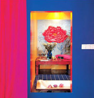 一踏進門,恍若隔世。一個極濃艷的、有蠢蠢欲動的香氣的房間,簡直驚世駭俗:極純的藍、極艷的粉、極亮的明黃,金色的頂,黑色的地,純粹得讓人窒息的色彩,就這么轟轟烈烈地蔓延,和隨處可見的藏式家具一起,把空間裝得滿滿的。加上幽幽暗暗的燈光,曲曲折折的通道……