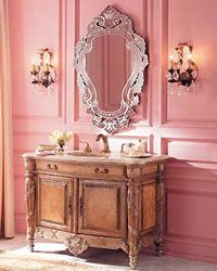 我看到這張照片時有點失笑,因為地面上有非常分明的界定:他的,她的。如果你家的衛(wèi)生間足夠大,這樣的設(shè)計會非常有意境,盡管看上去無比復雜,卻仍具有可操作性。雙人洗理臺,木柜配大理石臺面,金屬構(gòu)件全部為黑色,包括水龍頭、抽屜把手和毛巾架。鏡子的框架也采用木制,上面的圖案與洗理臺下的柜子相映成趣,非常古典。
